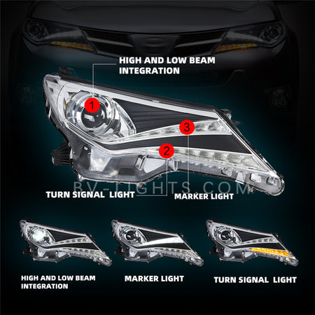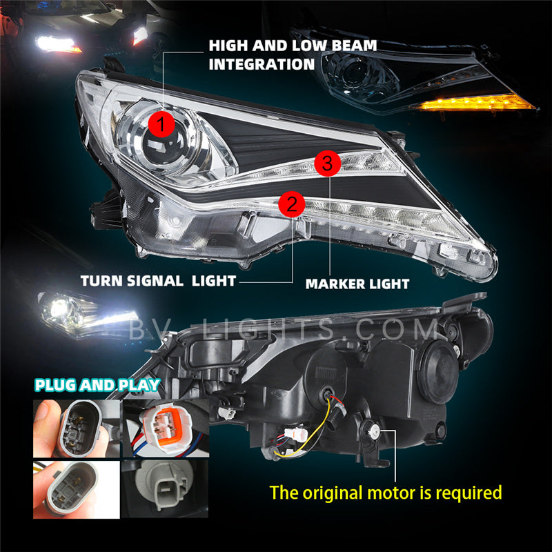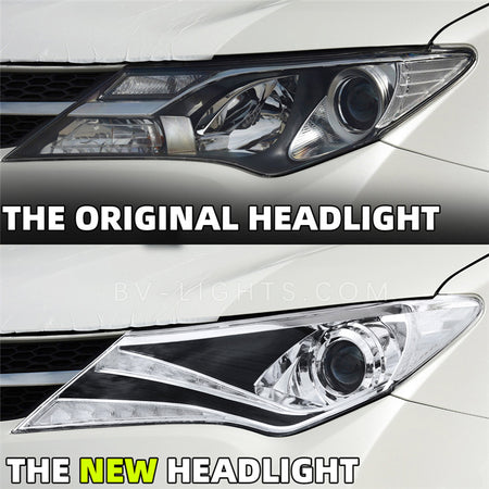 Revitalize your Toyota RAV4 (2013-2015) with BV-lights' advanced car headlights. Our front lamps, custom-made for Toyota models, revolutionize the concept of headlamp restoration. They seamlessly integrate with your vehicle, elevating your Toyota's road presence and outperforming standard factory headlights in both style and functionality.