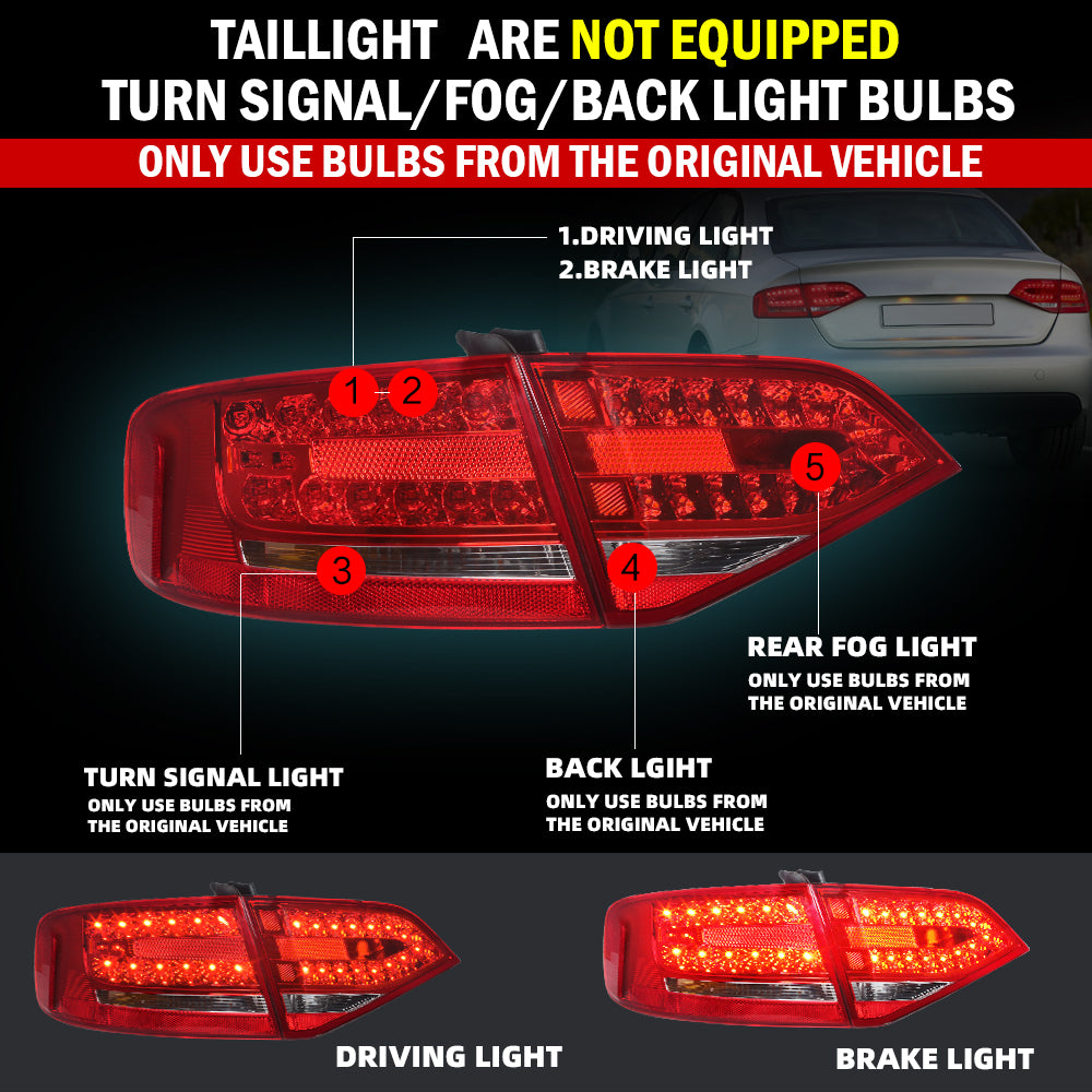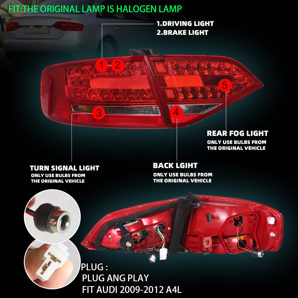 Upgrade your Audi A4L's rear lighting with premium LED tail lights engineered for the 2009-2012 model years. These modified units deliver enhanced brightness and clarity compared to factory halogen bulbs, improving visibility for following vehicles while adding a modern aesthetic.